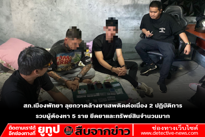 พัทยา – ตำรวจชุดสืบสวนปราบปรามยาเสพติด สภ.เมืองพัทยา เดินหน้าปฏิบัติการเชิงรุก ตามนโยบายรัฐบาลในการป้องกันและปราบปรามยาเสพติด เปิดปฏิบัติการปิดล้อมตรวจค้นเครือข่ายยาเสพติดในพื้นที่เมืองพัทยา สามารถจับกุมผู้ต้องหาได้รวม 5 ราย จาก 2 เหตุการณ์ต่อเนื่อง พร้อมของกลางยาเสพติดและทรัพย์สินจำนวนมาก