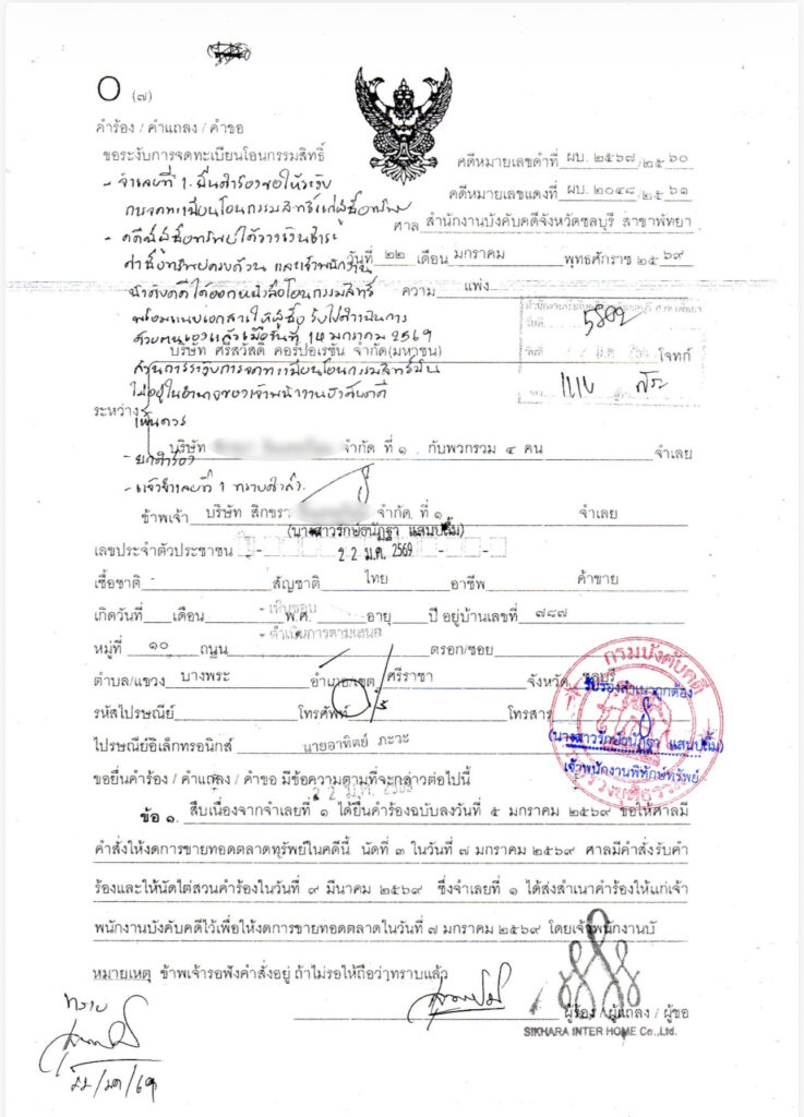 อย่างไรก็ตามหลังกระบวนการขายทอดตลาดเสร็จสิ้น บริษัท สิกขรา อินเตอร์โฮม จำกัด ได้ให้ฝ่ายกฏหมายยื่นคำร้องต่อเจ้าพนักงานบังคับคดี เพื่อให้ระงับการจดทะเบียนโอนกรรมสิทธิ์ที่ดินแปลงดังกล่าวให้ผู้ซื้อสินทรัพย์ เนื่องจากก่อนหน้านี้บริษัทได้ยื่นคำร้องต่อศาลขอให้ระงับการขายทอดตลาดทรัพย์ค้ำประกันหนี้ก้อนนี้ตั้งแต่วันที่ 5 ม.ค.69 และศาลได้ส่งหมายงดขายทอดตลาดไปยังเจ้าพนักงานบังคับคดีแล้ว โดยนัดไต่สวนคดีในวันที่ 9 มี.ค.2569 แต่เจ้าพนักงานบังคับคดี ยังคงเดินหน้าขายทอดตลาดทรัพย์ต่อไป บริษัทสิกขราฯ ในฐานะลูกหนี้ที่ได้รับความเสียหาย จึงมีหนังสือร้องไปยังกรมบังคับคดีเพื่อให้ระงับการจดทะเบียนโอนกรรมสิทธิ และรอฟังคำสั่งศาลต่อไป
