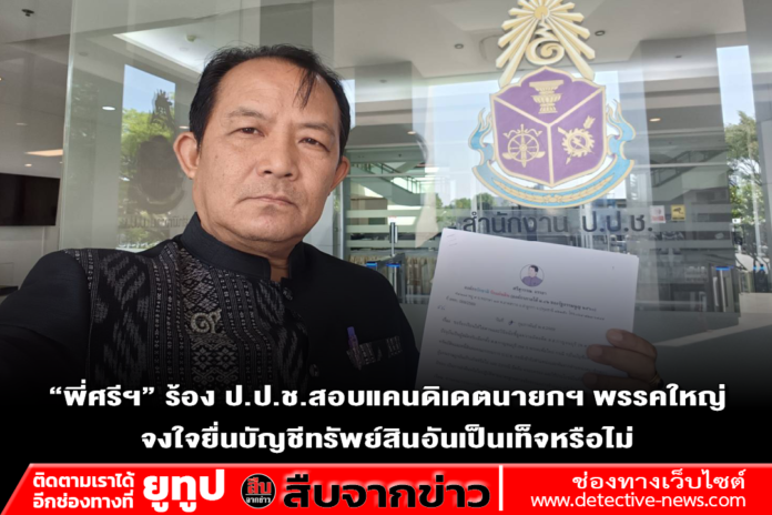 วันที่ 6 ก.พ.69 นายศรีสุวรรณ จรรยา ผู้นำองค์กรรักชาติ รักแผ่นดิน เปิดเผยว่าได้ยื่นหนังสือร้องเรียนต่อ ป.ป.ช.เพื่อขอให้ไต่สวนและมีความเห็นเพื่อชี้มูลความผิดแคนดิเดตนายกรัฐมนตรีของพรรคการเมืองใหญ่ท่านหนึ่ง ซึ่งเคยดำรงตำแหน่งรองนายกรัฐมนตรีและรัฐมนตรีว่าการกระทรวงใหญ่ในรัฐบาล น.ส.แพรทองธาร ชินวัตร ว่าได้ยื่นบัญชีแสดงรายการทรัพย์สินและหนี้สินต่อคณะกรรมการ ป.ป.ช. กรณีพ้นจากตำแหน่งเมื่อวันที่ 24 กันยายน 2568 อันเป็นเท็จหรือไม่