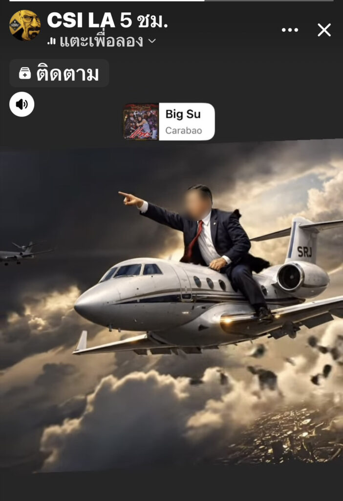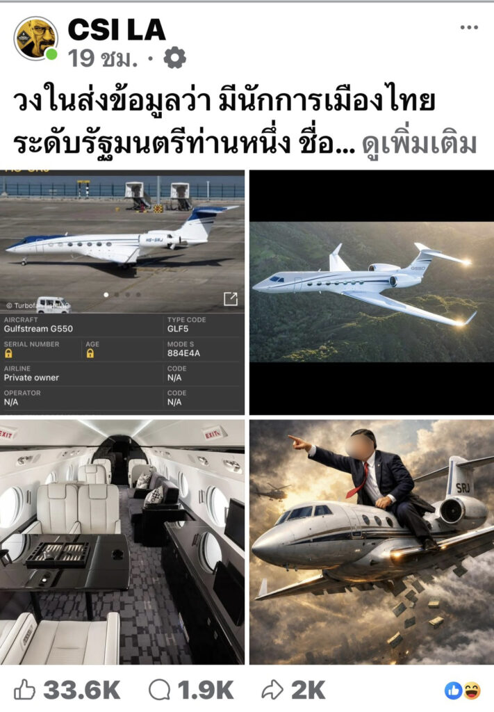 ทั้งนี้สืบเนื่องจากมีเพจ CSI LA ได้ออกมาเปิดเผยข้อมูลว่า “วงในส่งข้อมูลว่า มีนักการเมืองไทยระดับรัฐมนตรีท่านหนึ่ง ชื่อย่อ Big ส ซื้อเครื่องบินส่วนตัว Gulfstream G550 จากชาวต่างชาติที่ถูกวิจารณ์ว่าเป็นนายทุนเทาท่านหนึ่งมูลค่าจริงราว 800 ล้านบาท ผ่อนเดือนละ 100 ล้าน แต่แจ้งต่อ ปปช.ว่าซื้อมาเพียง 30 ล้านบาท บนตัวเครื่องยังมีอักษรย่อชื่อ-นามสกุล SRJ ล่าสุดสายข่าวแจ้งว่า เครื่องบินลำนี้ถูกใช้งานบินลำเลียงกระสุนไปยังเป้าหมายต่าง ๆ ในทางภาคเหนือและอีสาน จึงขอเรียกร้องให้หน่วยงานที่เกี่ยวข้อง ช่วยตรวจสอบเส้นทางการได้มาของ Private Jet ของ Big ส ว่าได้มาอย่างถูกต้องหรือไม่ และมีความเชื่อมโยงกับนายทุนเทาหรือขบวนการผิดกฎหมายหรือเปล่า”