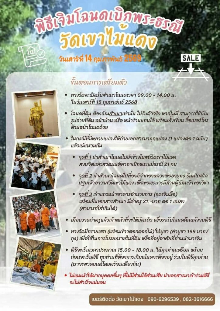 ด้วย ทางวัดเขาไม้แดง ตำบลบางพระ อำเภอศรีราชา จังหวัดชลบุรี จะมีการจัดพิธีเจิมโฉนดที่ดิน เบิกพระแม่ธรณี (ขายที่ ล้างอาถรรพ์ที่ดิน) ให้อยู่ร่มเย็นเป็นสุข โดยหลวงพ่อสง่า เทพเจ้ามีกินไม่รู้สิ้น ในวันเสาร์ที่ 14 กุมภาพันธ์ 2569 ที่จะถึงนี้ สำหรับ ประชาชนที่สนใจ ต้องการจะมาร่วมทำพิธีเจิมโฉนดที่ดิน ให้เตรียมใบโฉนดที่ดินแบบถ่ายเอกสาร มาให้เรียบร้อย (ทางวัดไม่มีที่ถ่ายเอกสาร) พร้อมค่าบูชาครู แปลงละ 21 บาท หรือตามกำลังศรัทธา หากไม่มีปัจจัยก็สามารถร่วมพิธีได้ วันเดียวเท่านั้น (วันที่ 14 กุมภาพันธ์ 2569) เริ่มรับลงทะเบียนโฉนดตั้งแต่เวลา 09.00 น.ไปจนถึงเวลา 14.00 น. เท่านั้น