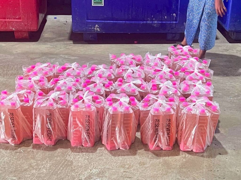 2.1 ผลิตภัณฑ์น้ำหวานรสผลไม้ ยี่ห้อ 78 (Seven-eight) ไม่มีเลขสารบบอาหาร สีต่างๆ กว่า 16 สี เช่น สีชมพู สีเขียว สีม่วง สีฟ้า จำนวน 7,800 ขวด