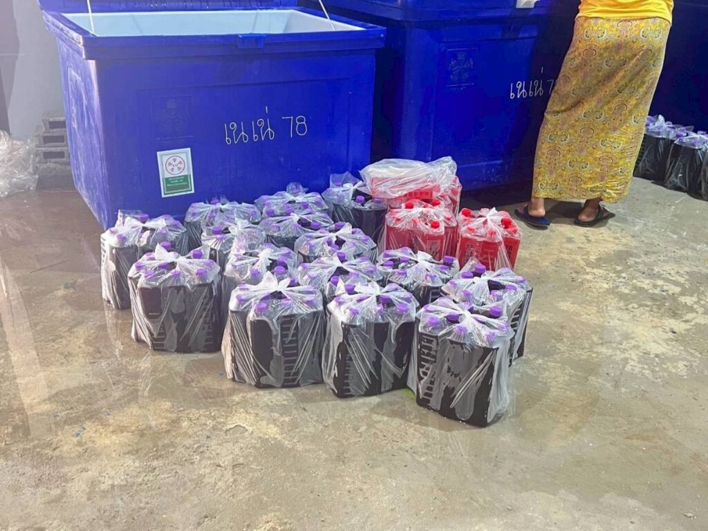 – ของเหลวใสบรรจุในถังพลาสติกสีน้ำเงิน จำนวน 2 ถัง