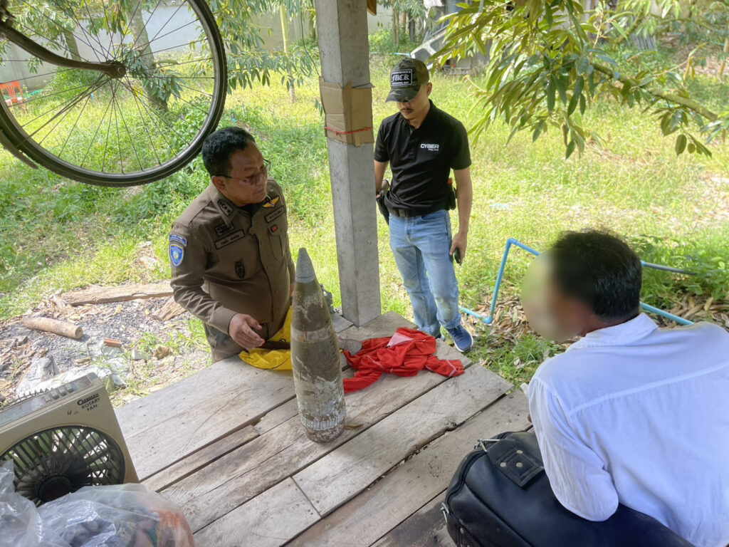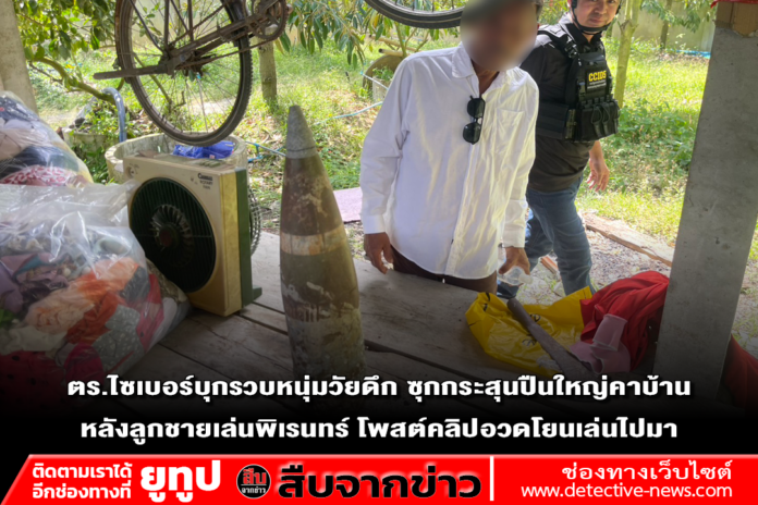 สืบเนื่องจากเจ้าหน้าที่ตำรวจชุด Cyber Guard กก.4 บก.สอท.5 ได้ตรวจสอบพบบัญชีเฟซบุ๊กรายหนึ่ง ได้โพสต์คลิปวิดิโอขณะกลุ่มวัยรุ่นชายกำลังเอาหัวกระสุนปืนใหญ่มาโยนเล่นหยอกล้อกันอย่างสนุกสนาน พร้อมติดแฮชแท็ก #ไทยนี้รักสงบแต่ถึงรบไม่ขลาด โดยมีประชาชนในโซเชียลที่พบเห็นคลิปดังกล่าวได้พยายามคอมเมนต์ตักเตือนถึงอันตราย และชาวโซเชียลยังได้พยายามช่วยกันแท็กเฟซบุ๊กของสถานีตำรวจพื้นที่ รวมทั้งเฟซบุ๊กของสำนักงานตำรวจแห่งชาติให้ช่วยตรวจสอบ เจ้าหน้าที่ตำรวจจึงได้ลงพื้นที่สืบสวนสอบสวน กระทั่งสามารถรวบรวมพยานหลักฐานเพื่อขออนุมัติหมานค้นจากศาลเข้าตรวจค้นได้สำเร็จ