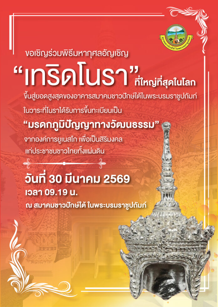 พล.ต.อ.สุรเชษฐ์ หักพาล หรือ “บิ๊กโจ๊ก” ในฐานะนายกสมาคมชาวปักษ์ใต้ ในพระบรมราชูปถัมภ์ ขอเชิญชวนประชาชนร่วมพิธีมหากุศลอัญเชิญ “เทริดโนรา” ที่ใหญ่ที่สุดในโลก ขึ้นประดิษฐาน ณ ยอดสูงสุดของอาคาร สมาคมชาวปักษ์ใต้ ในพระบรมราชูปถัมภ์ เพื่อความเป็นสิริมงคลแก่ประชาชนทั้งประเทศ พร้อมเปิดโอกาสให้ผู้มีจิตศรัทธาร่วมสมทบทุนสืบสานศิลปวัฒนธรรมภาคใต้