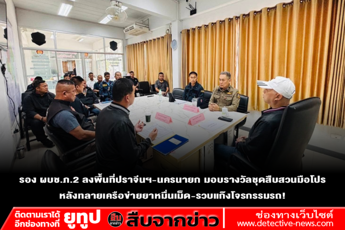 จากนั้นเวลา 14.00 น. ได้เดินทางต่อไปยัง กก.สส.ภ.จว.นครนายก เพื่อพบปะเจ้าหน้าที่ที่สามารถขยายผลจับกุมผู้ต้องหาคดีลักรถจักรยานยนต์ จำนวน 2 คดี พร้อมของกลางรถจักรยานยนต์ 2 คัน