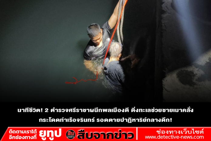 วีรบุรุษไม่สวมชุดเกราะ! สองตำรวจสายตรวจ สภ.ศรีราชา แท็กทีมพลเมืองดี ตัดสินใจกระโดดลงทะเลกลางดึก ฝ่ากระแสน้ำกู้ชีพชายวัยกลางคนสภาพมึนเมาหนัก หลังรับแจ้งเหตุกระโดดน้ำฆ่าตัวตายบริเวณปลายท่าเรือจรินทร์ ใช้เวลาเพียง 10 นาทีลากตัวขึ้นฝั่งปลอดภัยท่ามกลางลุ้นระทึกของชาวบ้านในพื้นที่ค่ะคะ