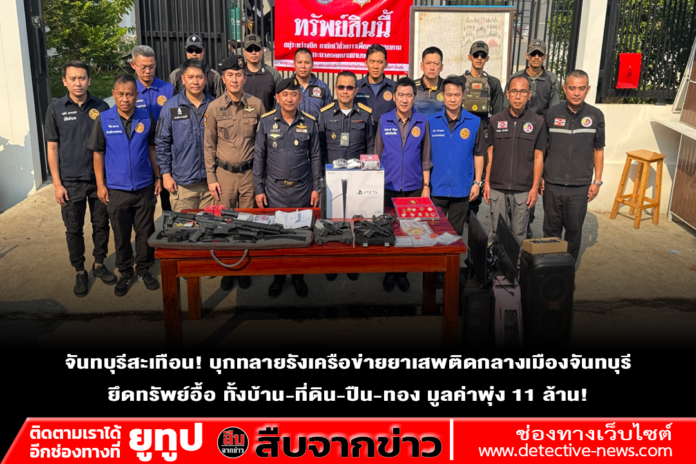 ปฏิบัติการกวาดล้างครั้งใหญ่! ตำรวจผนึกกำลัง ป.ป.ส. และฝ่ายปกครอง บุกตรวจค้นเป้าหมายกลางเมืองจันทบุรี สยบเครือข่ายยาเสพติดรายใหญ่ ยึดทรัพย์สินรวมมูลค่ากว่า 11 ล้านบาท ทั้งอาวุธปืน ทองคำ และโฉนดที่ดิน เจ้าหน้าที่เตรียมเช็กบิลเส้นทางการเงิน ขยายผลล่าตัวบงการใหญ่มาดำเนินคดีตามกฎหมายให้ถึงที่สุดค่ะคะ