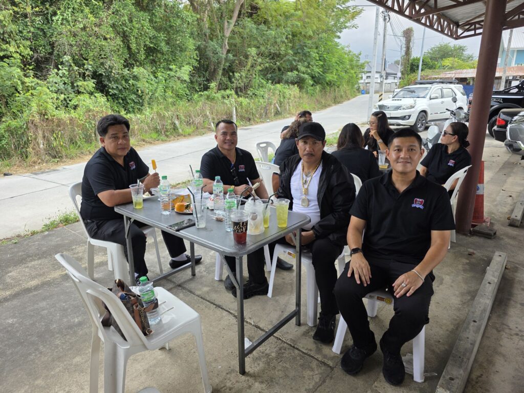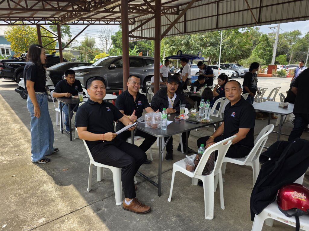สมาชิก กต.ตร.หนองปรือ สวมเสื้อสีดำประจำหน่วย ร่วมกันต้อนรับและพูดคุยกับเจ้าหน้าที่ตำรวจ รวมถึงประชาชนที่มาติดต่อราชการอย่างเป็นกันเอง สะท้อนความสัมพันธ์ที่ดีระหว่างภาคประชาชนกับเจ้าหน้าที่รัฐ