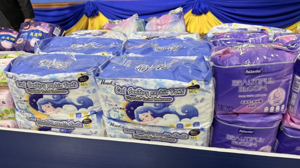 ของกลางที่ยึดได้ส่วนใหญ่เป็น ผ้าอนามัยยี่ห้อ Lyn Mie และ MIIOW รวมถึงน้ำยาซักผ้า รวมกว่า 1.2 ล้านชิ้น มูลค่าความเสียหายรวมกว่า 20.2 ล้านบาท