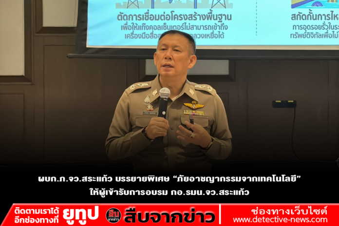 วันพุธที่ 18 กุมภาพันธ์ พ.ศ. 2569 เวลา 09.00 – 11.00 น. พล.ต.ต.ถาวร ดุลยวิทย์ ผบก.ภ.จว.สระแก้ว ได้รับเกียรติเป็นวิทยากรบรรยายพิเศษในหัวข้อ “ภัยอาชญากรรมจากเทคโนโลยี” ณ ห้องประชุมสุพรรณิการ์ โรงแรมอินโดจีน อำเภออรัญประเทศ จังหวัดสระแก้ว ให้แก่ผู้เข้ารับการอบรมหลักสูตรฯ กองอำนวยการรักษาความมั่นคงภายในจังหวัดสระแก้ว รุ่นที่ 1 ประจำปีงบประมาณ พ.ศ. 2569 โดยมีผู้เข้ารับการอบรมและเจ้าหน้าที่ที่เกี่ยวข้อง รวมทั้งสิ้น จำนวน 70 ราย