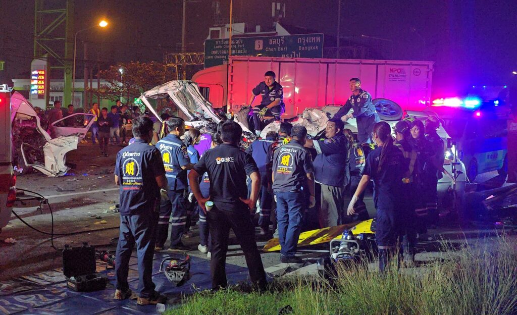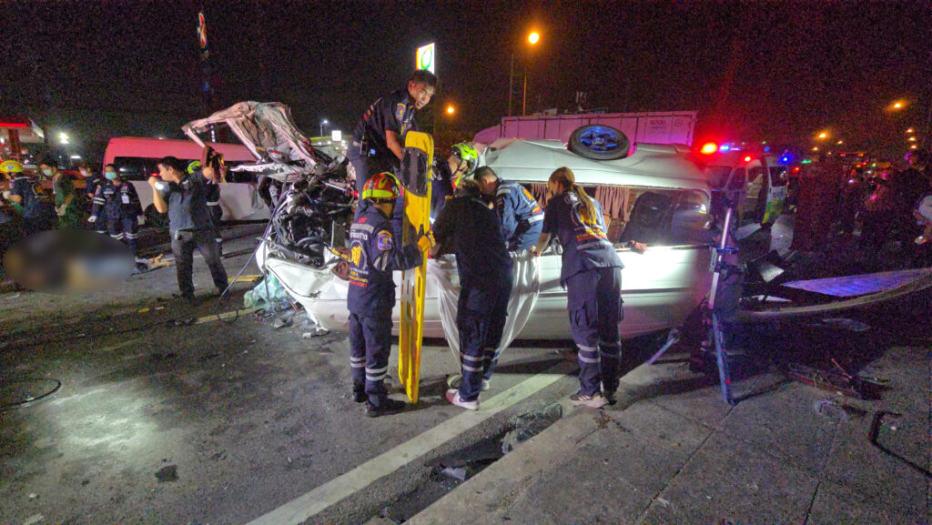 ในที่เกิดเหตุพบ รถตู้โดยสาร ชนกันจำนวน 2 คัน รวมทั้งรถยนต์อเนกประสงค์ ยี่ห้อ Ford Everest สีขาว หมายเลขทะเบียน จอ 7631 ชลบุรี ได้รับความเสียหายบริเวณด้านหน้าฝั่งซ้าย จอดอยู่เลนขวาสุด ใต้ท้องรถพบร่างผู้เสียชีวิต 1 รายเป็นชาย ส่วนเลนกลางพบรถยนต์ตู้ Toyota สีขาว หมายเลขทะเบียน ฮษ 1552 กรุงเทพมหานคร และมีรถยนต์ตู้อีกคัน หมายเลขทะเบียน ฮภ 2203 กรุงเทพมหานคร พลิกคว่ำอยู่ในสภาพพังยับเยินมีผู้ ได้รับบาดเจ็บติดอยู่ภายในรถตู้จำนวนหลายคน เจ้าหน้าที่กู้ภัยเร่ง ใช้อุปกรณ์ตัดถ่าง นำผู้ได้รับบาดเจ็บ ออกมาจากรถตู้ ก่อนช่วยกันปฐมพยาบาลเบื้องต้น ก่อนนำส่งโรงพยาบาล รวมผู้ได้รับบาดเจ็บทั้งสิ้น 16 ราย 3 ใน 16รายเสียชีวิต เป็นชาย 2 รายหญิง 1 ราย.