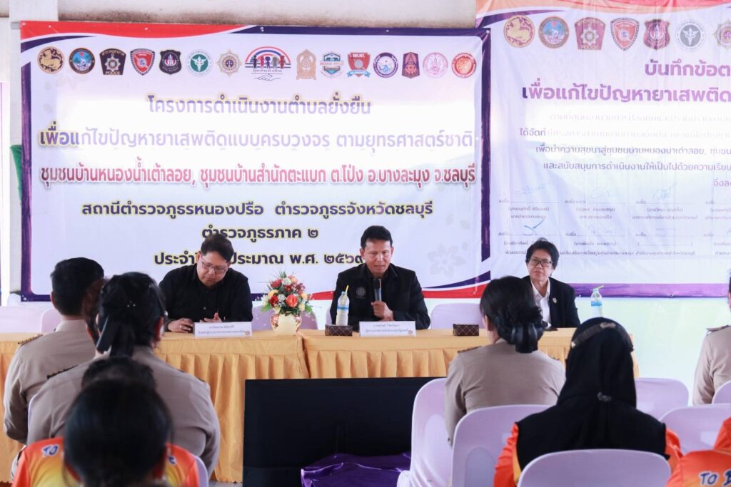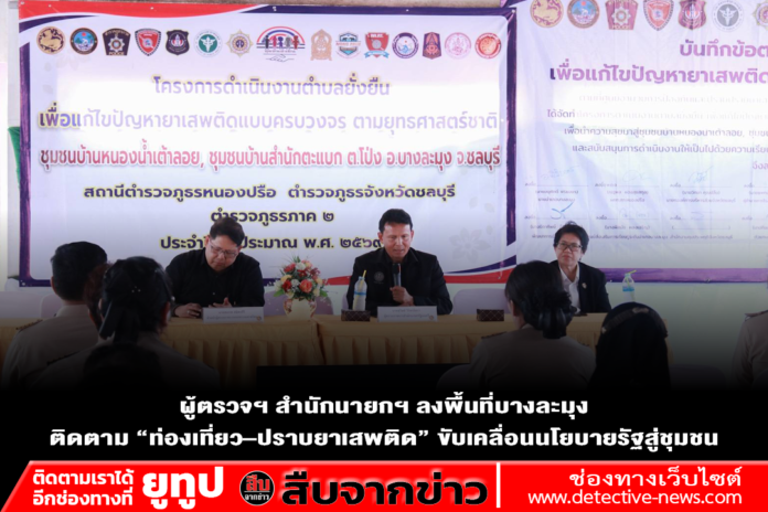 จุดที่ 2 เดินหน้าปราบยาเสพติด สร้างความปลอดภัยให้ประชาชน ณ บ้านหนองน้ำเต้าลอย หมู่ที่ 1 ตำบลโป่ง อำเภอบางละมุง จังหวัดชลบุรี ในพื้นที่บ้านหนองน้ำเต้าลอย คณะผู้ตรวจราชการได้ติดตามการดำเนินงานด้านการป้องกันและแก้ไขปัญหายาเสพติด ซึ่งถือเป็นวาระสำคัญของรัฐบาล เพื่อสร้างความปลอดภัยในชีวิตและทรัพย์สินของประชาชน ลดผลกระทบทางสังคม และเสริมสร้างความเข้มแข็งของชุมชนอย่างยั่งยืน