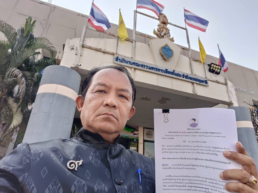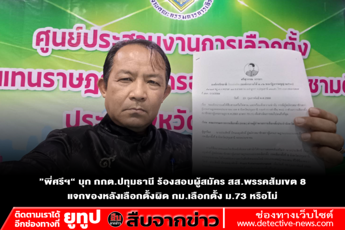 เวลา 9.30 น. วันที่ 24 ก.พ.69 ที่สำนักงานคณะกรรมการการเลือกตั้ง จ.ปทุมธานี นายศรีสุวรรณ จรรยา ผู้นำองค์กรรักชาติ รักแผ่นดิน ได้เดินทางมายื่นคำร้องถึงคณะกรรมการการเลือกตั้ง (กกต.) ผ่าน ผอ.การเลือกตั้งจังหวัดปทุมธานี เพื่อชี้เบาะแสให้สืบสวนหรือไต่สวน กรณีผู้สมัคร สส.พรรคประชาชน เขต 8 ปทุมธานีเเจกเครื่องดื่ม-เสื้อยืดหาเสียง ขอบคุณประชาชนในเขตเลือกตั้ง เข้าข่ายฝ่าฝืน มาตรา 73 (1) ของ พรป.เลือกตั้ง สส. 2561 หรือไม่