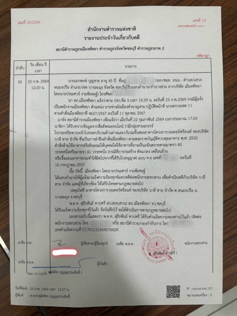 ล่าสุดวันนี้ (23 ก.พ. 69) นายปรเมศวร์ งามพิเชษฐ์ นายกเมืองพัทยา พร้อมด้วย นายมาโนช หนองใหญ่ รองนายกเมืองพัทยา นายเกียรติศักดิ์ ศรีวงษ์ชัย ปลัดเมืองพัทยา และนายสุริยา แก้วเขียว ผู้อำนวยการส่วนควบคุมอาคารเมืองพัทยา นำทีมเจ้าหน้าที่สำนักช่าง เจ้าหน้าที่ฝ่ายควบคุมอาคาร เจ้าหน้าที่นิติกร เจ้าหน้าที่ตำรวจ สภ.เมืองพัทยา และตำรวจท่องเที่ยว ลงพื้นที่จัดระเบียบการใช้พื้นที่โครงการดังกล่าว หลังมีข่าวการฝ่าฝืนคำสั่งห้ามใช้อาคาร