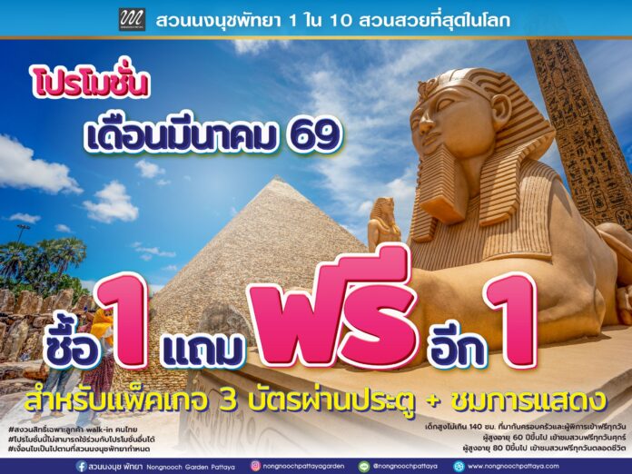 สวนนงนุชพัทยา โดย นายกัมพล ตันสัจจา ประธานสวนนงนุชพัทยา จัดโปรโมชั่น พิเศษตลอดเดือนมีนาคม 2569 ภายใต้แคมเปญ “ซื้อ 1 แถมฟรีอีก 1” เพื่อเปิดโอกาสให้นักท่องเที่ยวชาวไทยที่พลาดสิทธิ์ในเดือนที่ผ่านมา ได้กลับมาสัมผัสความงดงามและกิจกรรมครบวงจรในอาณาจักรแห่งการท่องเที่ยวเพื่อการเรียนรู้ระดับโลก
