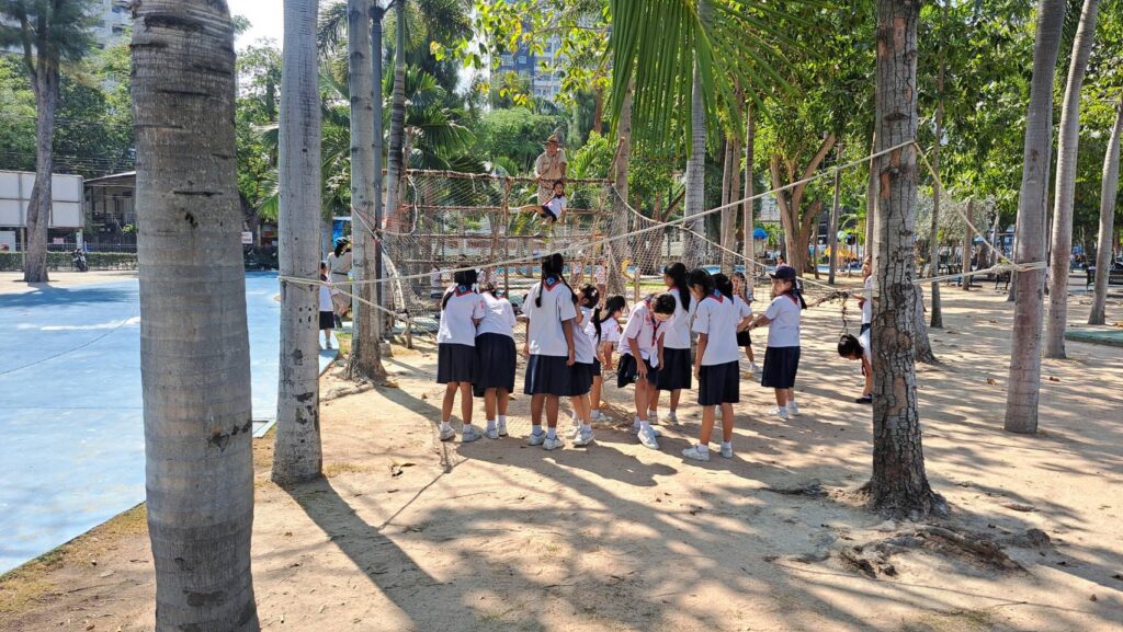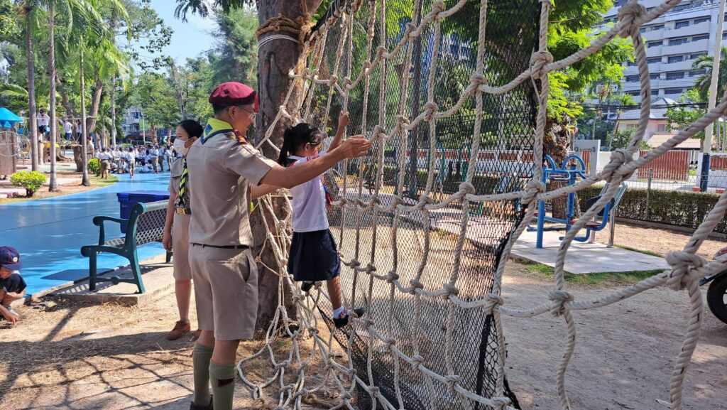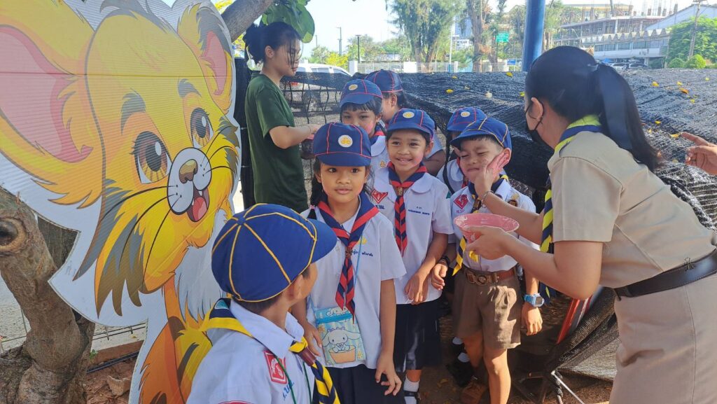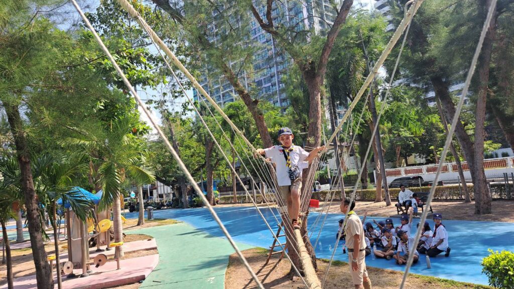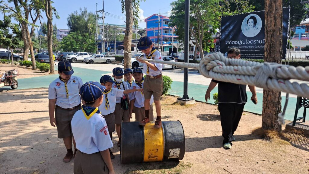 จากนั้นลูกเสือร่วมกิจกรรมเข้าฐานฝึกทักษะของร่างกายในด้านต่าง ๆ ในฐานการเรียนรู้ 17 ฐาน ได้แก่ 1.ฐานส่งสัญญาณ 2.ฐานคอมมอนโดคู่ 3.ลำเลียงน้ำ 4.ปีนบันไดเก็บของ 5.ไต่ถัง 6.ล้วงไห 7.ลำเลียงไข่ 8.กำแพงเมืองจีน 9.สะพานเชือก 3 เส้น 10.ไต่เชือก 11.ทาร์ซาน 12.ใยแมงมุม 13.มหาอุต 14.ตีกอล์ฟ 15.สกีบก 16.ปิดตาคลำเชือก และ 17.คานทรงตัว โดยมีวัตถุประสงค์เพื่อส่งเสริมให้ผู้เรียนมีคุณลักษณะอันพึงประสงค์เหมาะสมตามวัย ปลูกฝังให้ผู้เรียนมีระเบียบวินัยมีความรับผิดชอบมีศีลธรรมเป็นพลเมืองที่ดี และเพื่อปลูกฝังให้ผู้เรียนรู้จักบำเพ็ญตนมีจิตอาสาเพื่อประโยชน์สาธารณะสามารถใช้ในชีวิตประจำได้เหมาะสมตามวัย โดยมี ลูกเสือในระดับชั้นประถมศึกษาปีที่ 1-3 เข้าร่วมจำนวน 400 คน