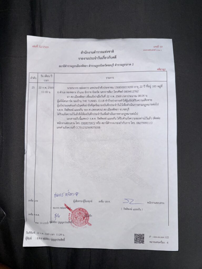 คดีเดินถึงไหน? มีการแจ้งความแล้วที่สถานีตำรวจภูธรเมืองพัทยา แต่เจ้าของร้านกลุ่มนี้และนายกสมาคมกลุ่มนี้ คือผู้อุปการะหรือไม่อย่างไร