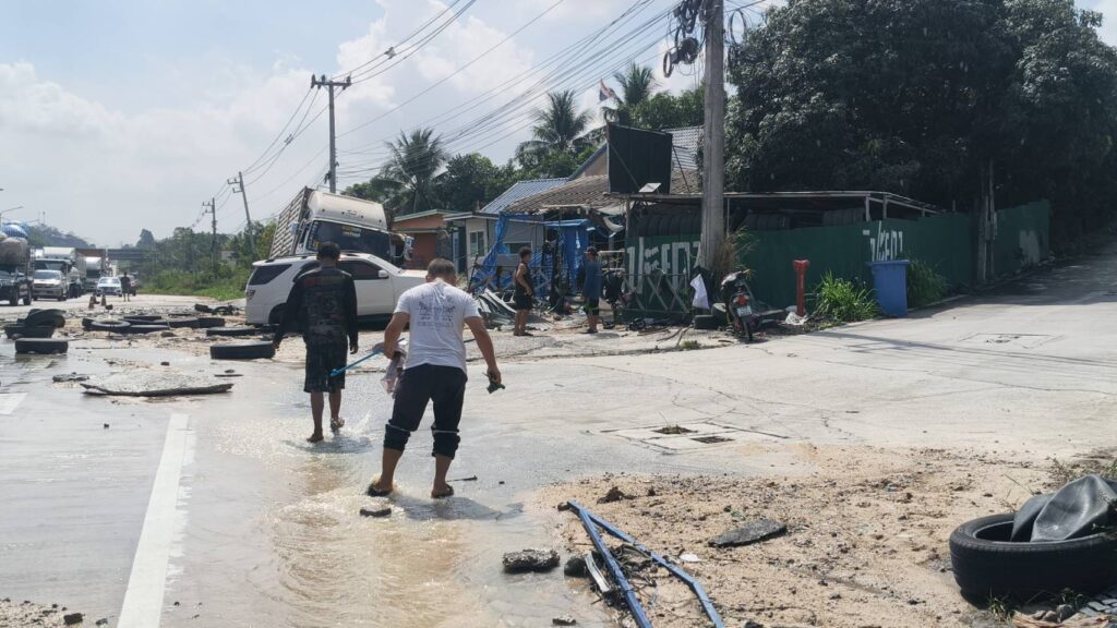 เมื่อเวลา 10:00 น วันที่ 2 มีนาคม 2569 ได้รับแจ้งจากประชาชนว่าท่อน้ำประปาแตก ท่วมร้านปะยาง24ชม.ได้รับความเสียหาย และ ทำให้น้ำท่วมบริเวณพื้นที่ดังกล่าวซึ่งอยู่ตรงบริเวณยูเทินปตท.เขาชี ถ.331มาบเอียง-แหลมฉบัง(ขาลงแหลมฉบัง) ต.หนองขาม อ.ศรีราชา จ.ชลบุรีผู้สื่อข่าวได้ลงพื้นที่ตรวจสอบบริเวณดังกล่าวพบว่าเป็นร้านปะยางรถยนต์24ชม.ชื่อว่าร้าน ธนายางยนต์ เลขที่ 512/4 ซอย22 ตำบลหนองขามอำเภอศรีราชาจังหวัดชลบุรี พบรถสิบล้อยี่ห้อ Hino ส่วนหัวสีขาวหมายเลขทะเบียน 84-3477 ชลบุรี ประสบเหตุกับ รถยนต์ ที่ นั่ง ส่วน บุคคล toyota fortuner หมายเลขทะเบียน ฆจ-9424 กรุงเทพมหานคร ได้รับความเสียหาย และมีรถจักรยานยนต์ Yamaha ฟีโน่ สีเขียวมิ้น และอุปกรณ์ไฟฟ้าต่างๆ ภายในร้านและข้าวของ ได้รับความเสียหายซึ่งจากการตรวจสอบในพื้นที่เกิดเหตุนั้น พบว่าท่อน้ำประปาได้แตกจึงทำให้น้ำท่วมบริเวณดังกล่าวและมีข้าวของเสียหายกระจัดกระจายลอยไปตามน้ำเป็นจำนวนมาก