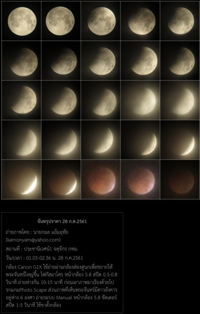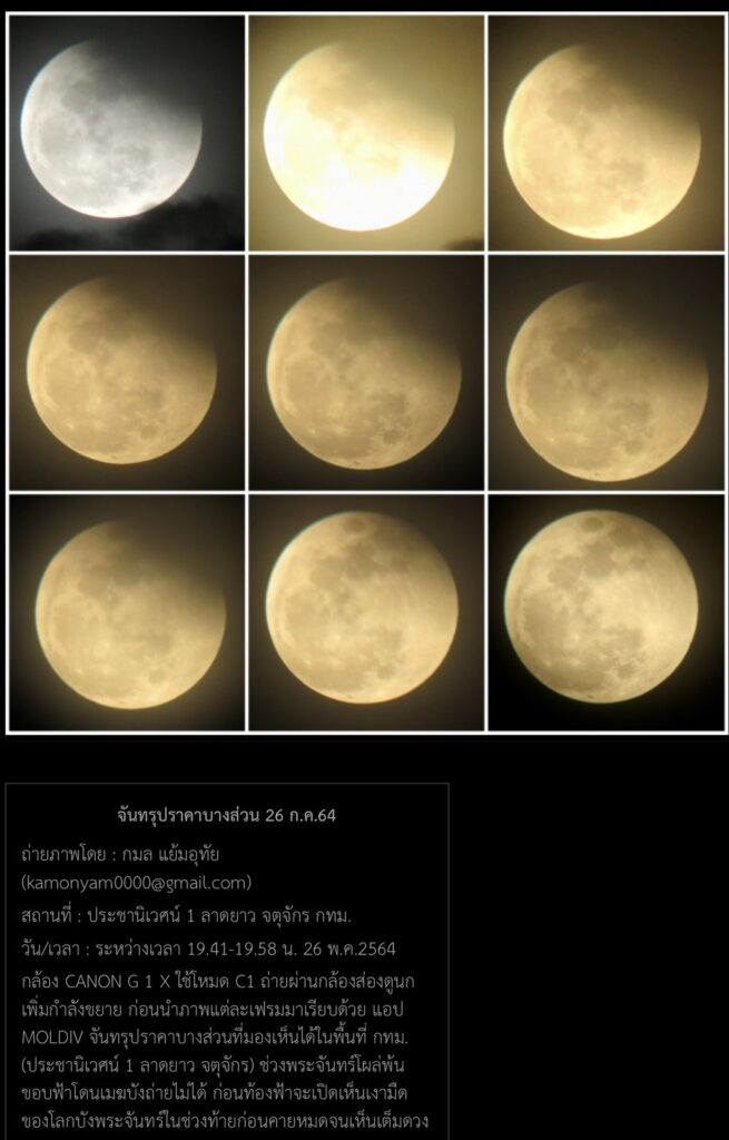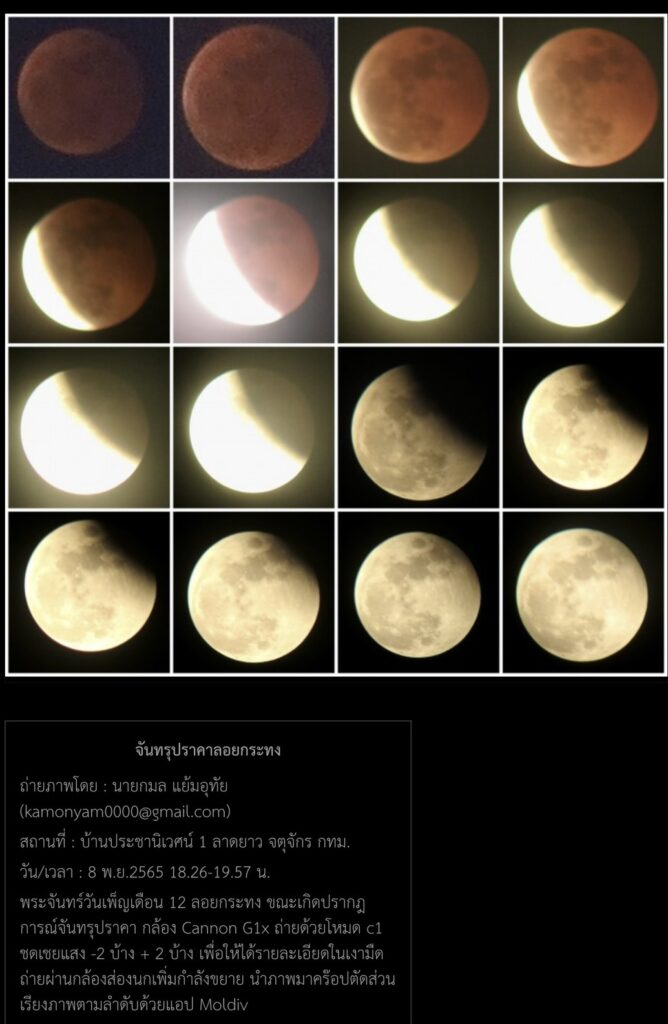 ทั้งนี้ เวลามองเห็นดวงจันทร์อาจแตกต่างกันเล็กน้อยในแต่ละพื้นที่ และด้วยช่วงเวลาที่สามารถสังเกตปรากฏการณ์ “จันทรุปราคาเต็มดวง” มีระยะเวลาประมาณ 39 นาที ดวงจันทร์จะอยู่ในตำแหน่งค่อนข้างต่ำใกล้ขอบฟ้า แนะนำให้เลือกจุดสังเกตการณ์ที่เป็นพื้นที่โล่ง มองเห็นขอบฟ้าทางทิศตะวันออกได้ชัดเจน และไม่มีอาคารหรือต้นไม้บดบัง เช่น บนตึกสูง จุดชมวิว ริมทะเล และในกรณีที่สภาพอากาศไม่เอื้ออำนวย มีเมฆมากหรือฝนตก อาจทำให้ไม่สามารถสังเกตการณ์ได้ชัดเจน
