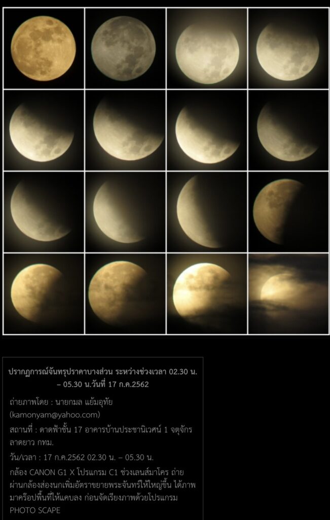จากนั้นเริ่มเห็นดวงจันทร์ปรากฏเว้าแหว่งบางส่วนและค่อย ๆ ออกจากเงามืดของโลก และสิ้นสุดปรากฏการณ์จันทรุปราคาบางส่วน ในเวลา 20.17 น. และพ้นจากเงามัวของโลก จนสิ้นสุดปรากฏการณ์