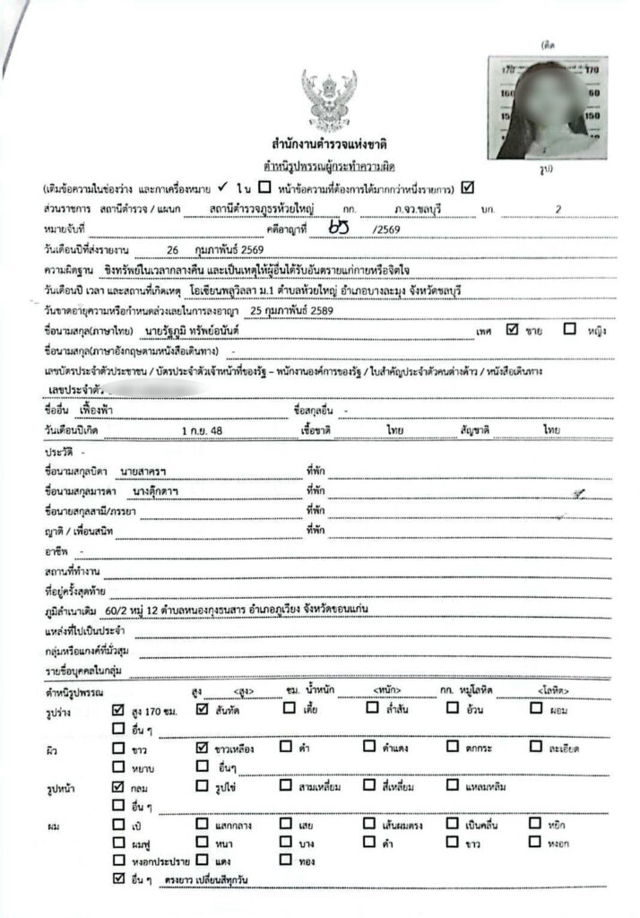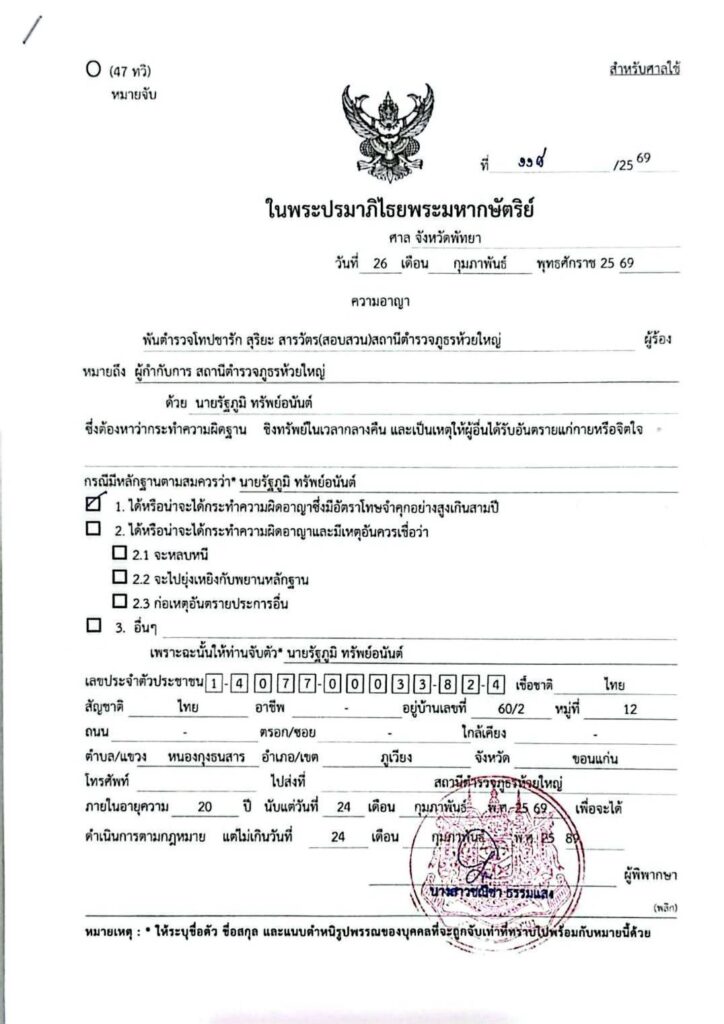 เมื่อวันที่ 5 มีนาคม 2569 เวลาประมาณ 13.30 น. เจ้าหน้าที่ตำรวจชุดจับกุมจากสถานีตำรวจท่องเที่ยวพัทยา และหน่วยงานที่เกี่ยวข้อง ได้นำกำลังเข้าตรวจสอบที่พักบริเวณ “สยาม พรีวี่ เรสซิเดนซ์” ย่านห้วยขวาง กรุงเทพฯ หลังได้รับเบาะแสสำคัญจากสายลับว่ามีบุคคลตามหมายจับคดีอุกฉกรรจ์กบดานอยู่