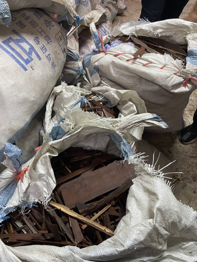 2.เศษไม้จันทร์หอมและไม้พยุง บรรจุอยู่ในกระสอบ จำนวน 498 กระสอบ หนักกระสอบละ 40 กก. น้ำหนักรวม 19,920 กก.(ประมาณ 20 ตัน)