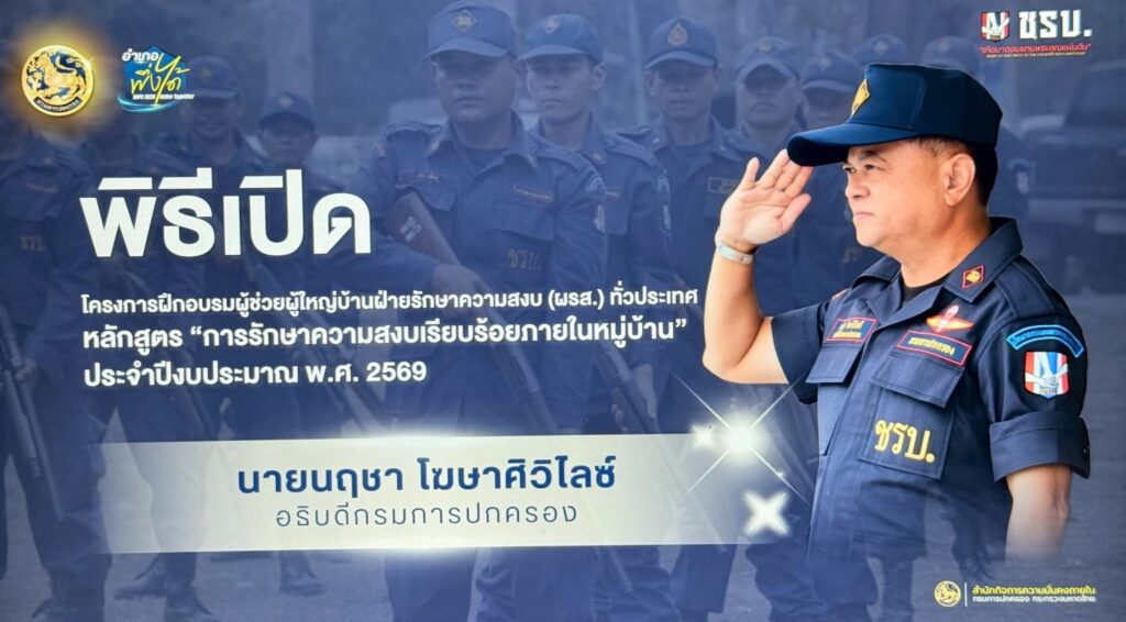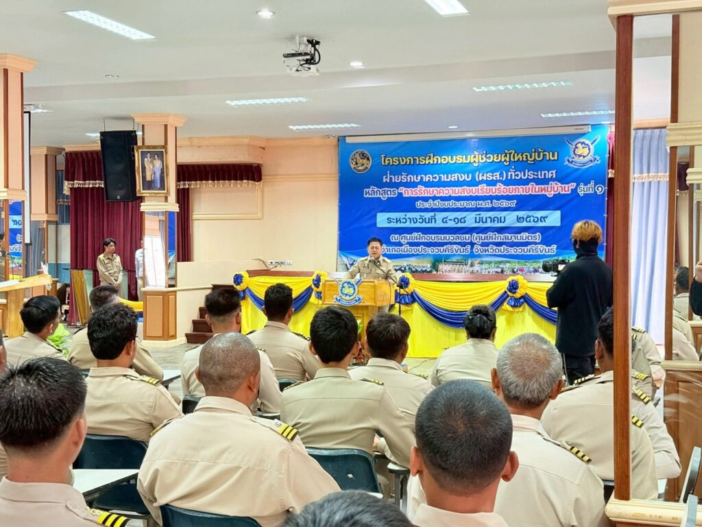 วันที่ 5 มี.ค. 69 เวลา 13.30 น. นายนฤชา โฆษาศิวิไลซ์ อธิบดีกรมการปกครอง เป็นประธานเปิดโครงการฝึกอบรมผู้ช่วยผู้ใหญ่บ้านฝ่ายรักษาความสงบ (ผรส.) ทั่วประเทศ “หลักสูตรการรักษาความสงบเรียบร้อยภายในหมู่บ้าน” ประจำปีงบประมาณ พ.ศ. 2569 โดยมีผู้ว่าราชการจังหวัดประจวบคีรีขันธ์ รองผู้ว่าราชการจังหวัด อธิการวิทยาลัยการปกครอง (นายพัชรพัชร์ ศรีธัญญนนท์) ผู้อำนวยการสำนัก/กองในสังกัดกรมการปกครอง ปลัดจังหวัด นายอำเภอ หัวหน้าส่วนราชการ คณะวิทยากร เจ้าหน้าที่ และผู้เข้ารับการฝึกอบรม เข้าร่วมในพิธี ณ ศูนย์ฝึกอบรมมวลชน (ศูนย์ฝึกสมานมิตร) อำเภอเมืองประจวบคีรีขันธ์ จังหวัดประจวบคีรีขันธ์