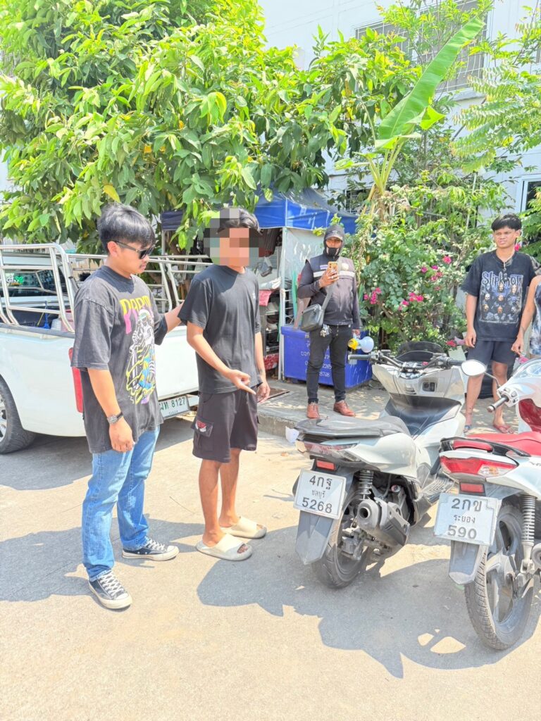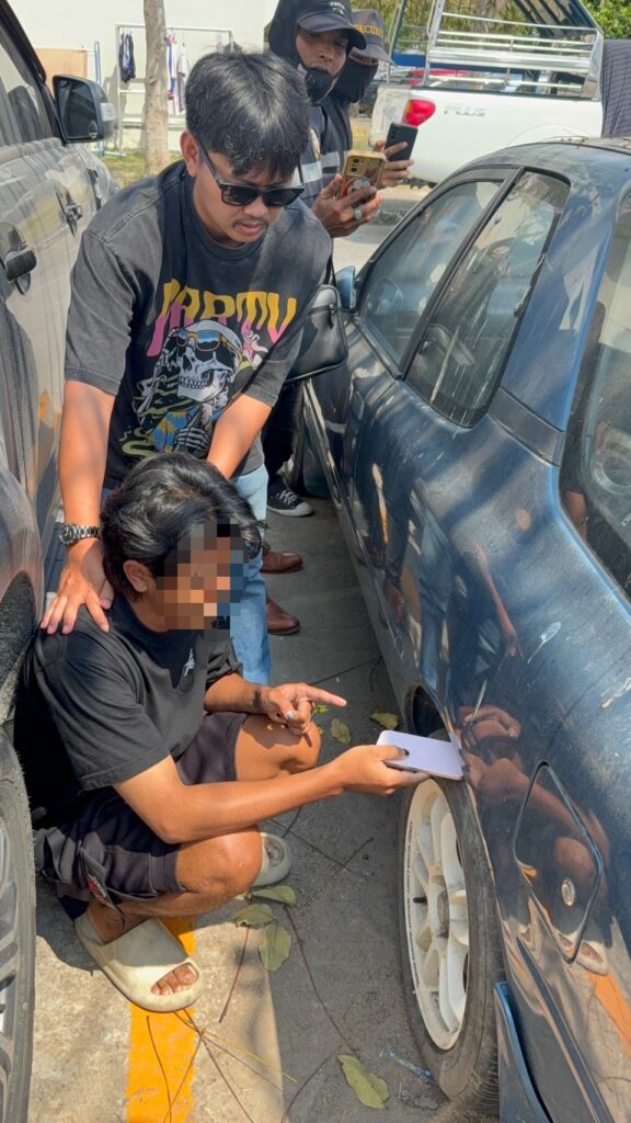 สถานที่จับกุมบริเวณริมถนนข้างตึกที่ 55 ภายในหมู่บ้านเอื้ออาทรนาจอมเทียน ม.2 ต.นาจอมเทียน อ.สัตหีบ จ.ชลบุรี