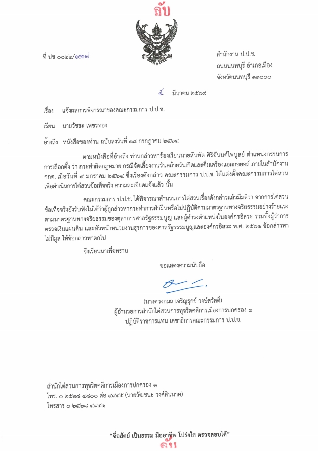 9 มีนาคม 2569 นายวัชระ เพชรทอง อดีต สส.พรรคประชาธิปัตย์ กล่าวว่า ตามที่ได้ยื่นหนังสือร้องเรียนต่อพลตำรวจเอกวัชรพล ประสานราชกิจ ประธานคณะกรรมการป้องกันและปราบปรามการทุจริตแห่งชาติ(ปปช.) เมื่อวันที่ 18 กรกฎาคม 2564 ร้องเรียนนายสันทัด ศิริอนันต์ไพบูลย์ ตำแหน่ง กรรมการการเลือกตั้ง ว่าจัดเลี้ยงฉลองวันเกิดที่ห้องประชุมบนอาคาร กกต.ที่ศูนย์ราชการแจ้งวัฒนะมีการดื่มไวน์และสุรากับนายแสวง บุญมีกับพวกรวม 15 คนและข้อกล่าวหาอื่นๆ อีกเช่นใช้รถยนต์หลวง น้ำมันหลวงตลอดทุกวันเสาร์อาทิตย์ทั้งปี (12เดือน) แม้กระทั่งไปงานเช้งเม้งบรรพบุรุษของตน ปรากฏว่าคณะกรรมการ ป.ป.ช. โดยนางดวงกมล เจริญรุกข์ วงษ์สวัสดิ์ ผู้อำนวยการสำนักไต่สวนการทุจริตคดีการเมืองการปกครอง ๑ ปฏิบัติราชการแทน เลขาธิการคณะกรรมการ ป.ป.ช. มีหนังสือแจ้งผลการพิจารณาสำนวนการไต่สวนเรื่องดังกล่าวแล้วมีมติว่า จากการไต่สวนข้อเท็จจริงยังรับฟังไม่ได้ว่าผู้ถูกกล่าวหากระทำการฝ่าฝืนหรือไม่ปฏิบัติตามมาตรฐานทางจริยธรรมอย่างร้ายแรงตามมาตรฐานทางจริยธรรมของตุลาการศาลรัฐธรรมนูญ และผู้ดำรงตำแหน่งในองค์กรอิสระ รวมทั้งผู้ว่าการตรวจเงินแผ่นดิน และหัวหน้าหน่วยงานธุรการของศาลรัฐธรรมนูญและองค์กรอิสระ พ.ศ. ๒๕๖๑ ข้อกล่าวหาไม่มีมูล ให้ข้อกล่าวหาตกไป
