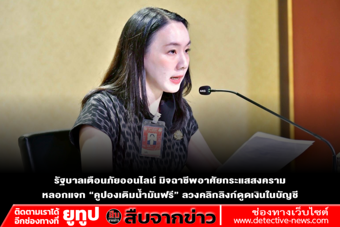 ทำเนียบ วันนี้ (16 มี.ค.) นางสาวลลิดา เพริศวิวัฒนา รองโฆษกประจำสำนักนายกรัฐมนตรี เปิดเผยว่า ศูนย์ต่อต้านอาชญากรรมออนไลน์ (AOC 1441) แจ้งเตือนประชาชนให้ระวัง กลโกงออนไลน์รูปแบบใหม่ที่อาศัยกระแสสถานการณ์ความตึงเครียดของโลกและราคาน้ำมันที่ผันผวน เป็นเครื่องมือหลอกลวง โดยมิจฉาชีพส่งข้อความหรือโฆษณาปลอมชักชวนว่า “แจกคูปองเติมน้ำมันฟรี” หรือ “ส่วนลดน้ำมันช่วงวิกฤตพลังงาน” เพื่อหลอกให้ประชาชนกดลิงก์