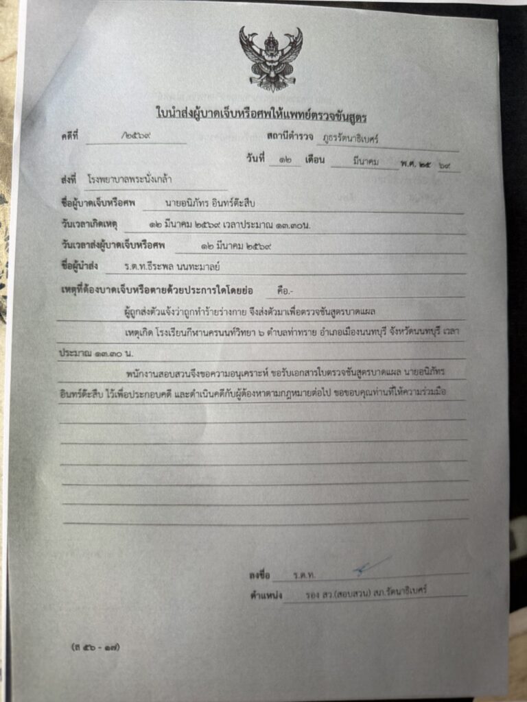 เมื่อเวลา 10.30 น.วันที่ 17 มีกค.69 ที่ บริเวณหน้าแดนเนรมิตเก่า ถนนพหลโยธิน “จ่าคิงส์ แตงทิม สะพานใหม่”ได้นำนางอนิสา สงวนนามสกุล อายุ 46 ปี มารดาของ “น้องแม็ก” (นามสมมติ) อายุ 18 ปี นักเรียนชั้น ม.6 โรงเรียนกีฬาแห่งหนึ่งในจังหวัดนนทบุรี เดินทางเข้าพบพนักงานสอบสวน กองบังคับการปราบปราม เพื่อแจ้งความดำเนินคดีกับผู้ช่วยโค้ชรายหนึ่งที่ใช้ความรุนแรงทำร้ายร่างกายลูกชายมาอย่างต่อเนื่องใช้ไม้ตีกว่า 20 ครั้ง โดยลูกชายถูกคุณครูคนนี้ใช้ไม้ตีมาตั้งแต่ ม.5 จนตอนนี้จบ ม.6 แล้ว หนักสุดที่เป็นฟางเส้นสุดท้าย คือ ช่วงเช้าวันที่ 12 มีนาคมที่ผ่านมา ลูกชายกำลังนอนอยู่ ปรากฏว่าคุณครูเดินเข้ามาถลกผ้าห่ม แล้วใช้ไม้ตีลงที่ต้นขาน้องอย่างแรง จากนั้นก็ไล่ตีเด็กอีกทั้งหมด 7 คน ตีทั้งหัวและหลัง เฉพาะลูกชายโดนตีไปแล้วถึง 3 ครั้ง ในฐานะแม่รู้สึกไม่สบายใจและเครียดมาก เพราะทั้งชีวิตยังไม่เคยตีลูกเลย จึงมาร้องขอความเป็นธรรม ก่อนหน้านี้ไปแจ้งความที่ สภ.รัตนาธิเบศร์ แล้ว แต่คดีก็ไม่มีความคืบหน้า