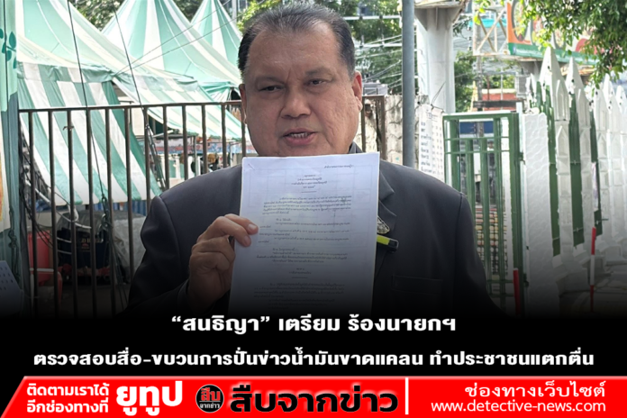 ผู้สื่อข่าวรายงานว่า ในวันพรุ่งนี้ 18 มีนาคม 2569 เวลา 10.30 น. นายสนธิญา สวัสดี อดีตที่ปรึกษากรรมาธิการการกฎหมาย การยุติธรรม และสิทธิมนุษยชน สภาผู้แทนราษฎร เตรียมเดินทางไปยังศูนย์รับเรื่องร้องทุกข์ของรัฐบาล (ฝั่งสำนักงาน ก.พ.) เพื่อยื่นหนังสือถึงนายกรัฐมนตรี ให้พิจารณาสั่งการตรวจสอบกรณีการนำเสนอข่าวเรื่องการกักตุนและการขาดแคลนน้ำมัน
