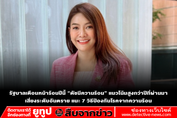 ทำเนียบ วันนี้ (18 มี.ค.) นางสาวอัยรินทร์ พันธุ์ฤทธิ์ รองโฆษกประจำสำนักนายกรัฐมนตรี เปิดเผยว่า จากสถานการณ์อากาศที่ร้อนจัดของประเทศไทยขณะนี้ ส่งผลกระทบต่อสุขภาพและคุณภาพชีวิตของประชาชน ทั้งนี้กรมอุตุนิยมวิทยาได้เฝ้าระวังสถานการณ์ค่าดัชนีความร้อน (Heat Index) ซึ่งเป็นค่าความร้อนที่ร่างกายรู้สึกได้จริง หรือ Feel like ใช้บ่งชี้ระดับความเสี่ยงที่ร่างกายอาจได้รับผลกระทบจากความร้อน โดยคำนวณจากอุณหภูมิและความชื้นสัมพัทธ์ ซึ่งต่างจากอุณหภูมิทั่วไป ที่วัดเพียงระดับความร้อนหรือความเย็นของอากาศ โดยในปีที่ผ่านมา ประเทศไทยมีค่าดัชนีความร้อนสูงสุดถึง 59.5 องศาเซลเซียส และมีผู้เสียชีวิตจากความร้อน จำนวน 21 คน