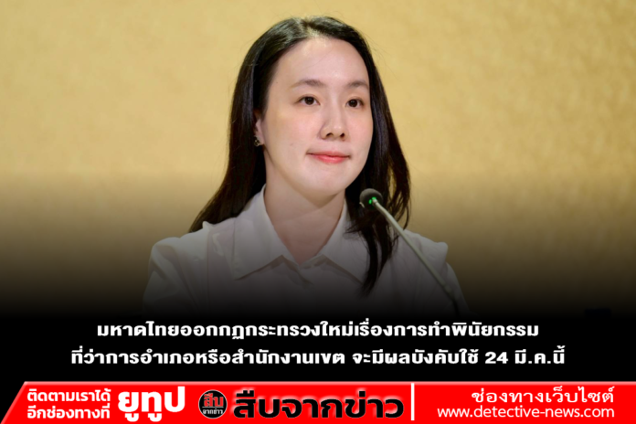 มหาดไทยออกกฏกระทรวงใหม่เรื่องการทำพินัยกรรม ที่ว่าการอำเภอหรือสำนักงานเขต จะมีผลบังคับใช้ 24 มี.ค.นี้ จะทำให้กระบวนการทำพินัยกรรมมีความสะดวกและลดข้อพิพาทเกี่ยวกับมรดกในอนาคต