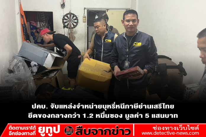 บก.ปคบ.แถลงผลการจับกุมผู้ต้องหาลักลอบขายบุหรี่ต่างประเทศผิดกฎหมาย บริเวณซอยเสรีไทย 11 พร้อมขยายผลตรวจค้นหอพัก ยึดของกลางรวมกว่า 12,000 ซอง เตรียมออกหมายเรียกเจ้าของห้องเช่าดำเนินคดี