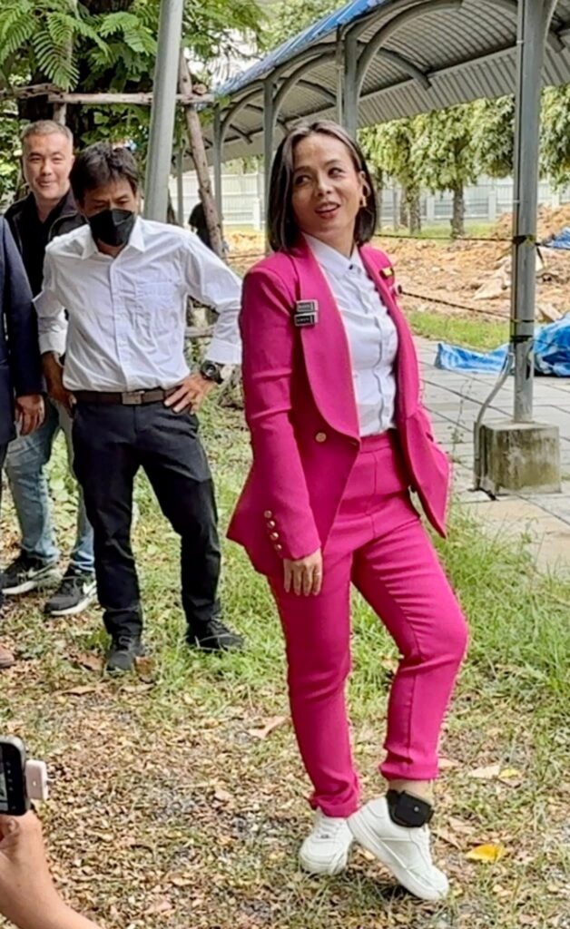 (ภาพ : ถ่ายเมื่อ 30 ก.ย.68 เจ๊พัช ถลกขากางเกงโชว์กำไล อีเอ็ม ให้ผู้สื่อข่าวดูที่ กองปราบฯ บช.ก.)