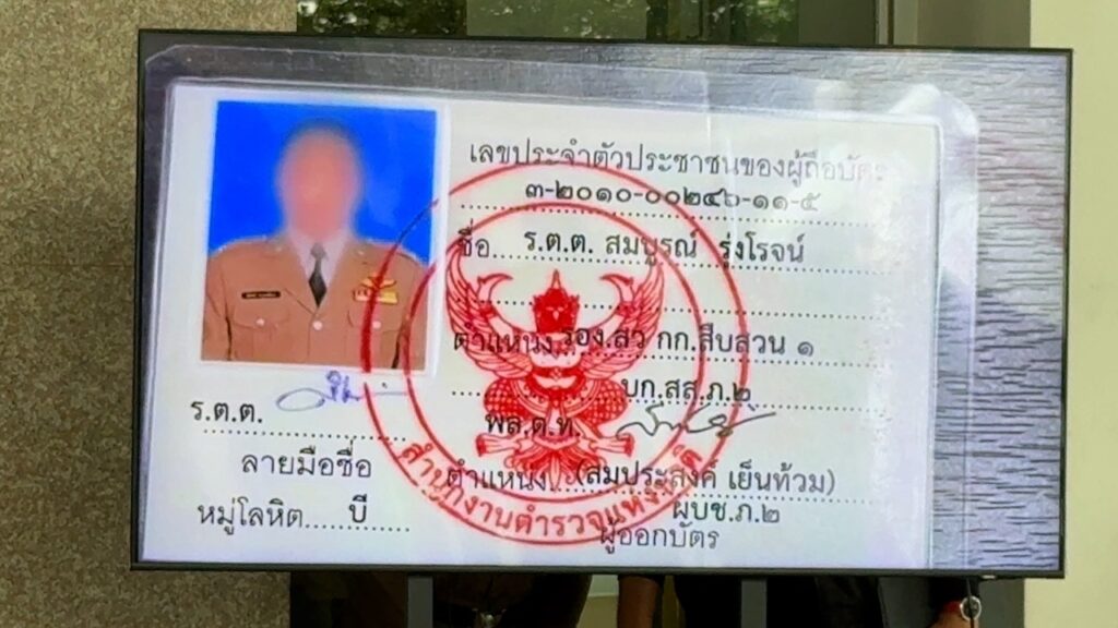 ขณะเข้าตรวจค้น นายประกายเพ็ชรได้แสดงบัตรข้าราชการตำรวจระบุชื่อ “ร้อยตำรวจตรี สมบูรณ์ รุ่งโรจน์” สังกัดสืบสวนภาค 2 เพื่อยืนยันตัวตนหวังให้เจ้าหน้าที่ปล่อยตัว แต่จากการตรวจสอบฐานข้อมูลระบบทะเบียนพลอย่างละเอียดพบว่าเป็น “บัตรปลอม” เจ้าหน้าที่จึงควบคุมตัวทั้งคู่มาสอบสวนขยายผล