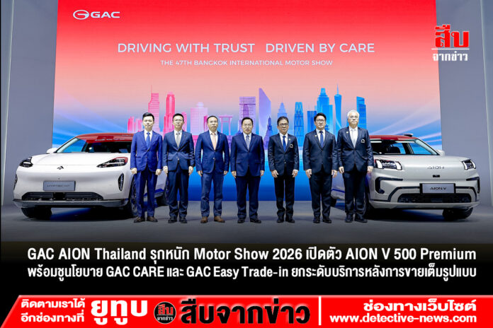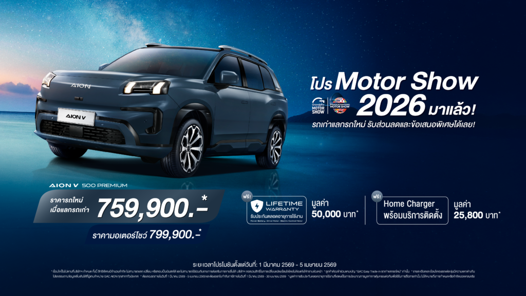 (กรุงเทพฯ, 23 มีนาคม 2569) – GAC AION Thailand ประกาศความยิ่งใหญ่ในงาน Bangkok International Motor Show 2026 ขนทัพยนตรกรรมพลังงานทางเลือกใหม่จัดแสดงแบบเต็มพิกัด พร้อมไฮไลต์สำคัญถึง 3 ประการ ได้แก่ การเผยโฉมรถยนต์รุ่นใหม่ล่าสุด GAC AION V 500, การประกาศนโยบาย GAC CARE เพื่อยกระดับมาตรฐานการบริการหลังการขายแบบครบวงจร,และเปิดตัวโครงการ GAC Easy Trade-in, สะท้อนความมุ่งมั่นในการสร้างระบบนิเวศยานยนต์ไฟฟ้าที่สมบูรณ์แบบและยั่งยืนในประเทศไทย