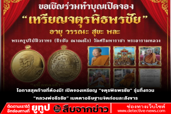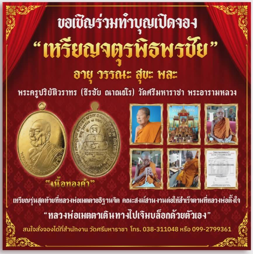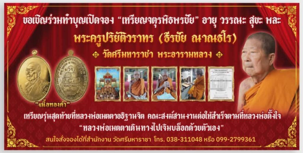 พลาดไม่ได้ด้วยประการทั้งปวง! วัดศรีมหาราชาเปิดจองเหรียญ “จตุรพิธพรชัย” (อายุ วรรณะ สุขะ พละ) วัตถุมงคลรุ่นสุดท้ายที่พระครูปริยัติวราทร (หลวงพ่อธีรชัย ญาณธโร) เมตตาเจิมบล็อกและอธิษฐานจิตด้วยตนเอง เพื่อนำปัจจัยบำรุงพระอารามตามเจตนารมณ์สุดท้ายของหลวงพ่อ ชวนสายบุญร่วมจารึกประวัติศาสตร์แห่งศรัทธาก่อนปิดตำนาน