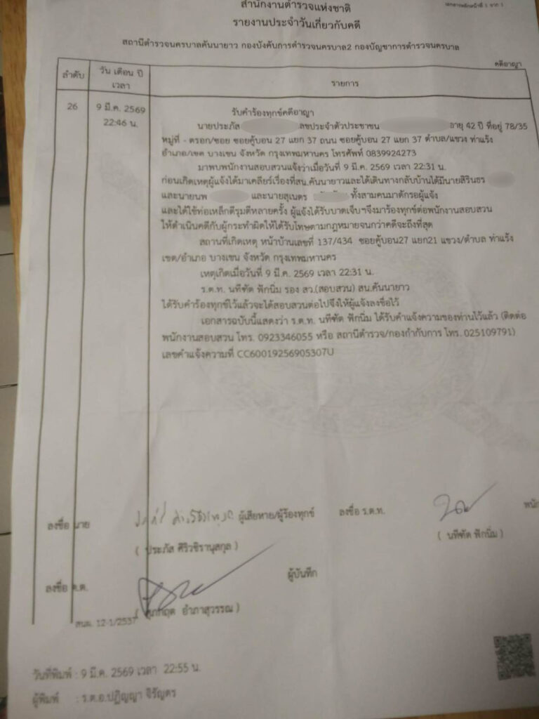 เมื่อเวลา 10.30 น. วันที่ 24 มี.ค.69 ที่ บริเวณริมฟุตบาทหน้าแดนเนรมิตเก่า “จ่าคิงส์ แตงทิม สะพานใหม่” พา น.ส.ดาว (นามสมมติ) เข้าร้องเรียนต่อพนักงานสอบสวน กองบังคับการปราบปราม เพื่อขอความเป็นธรรมและความคุ้มครอง หลังครอบครัวถูกกลุ่มเพื่อนบ้านคุกคามอย่างหนัก และถูกรุมทำร้ายร่างกายด้วยอาวุธเหล็กเส้นจนได้รับบาดเจ็บสาหัส แต่คดีกลับนิ่งเฉยที่ สน.คันนายาว