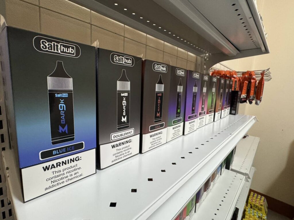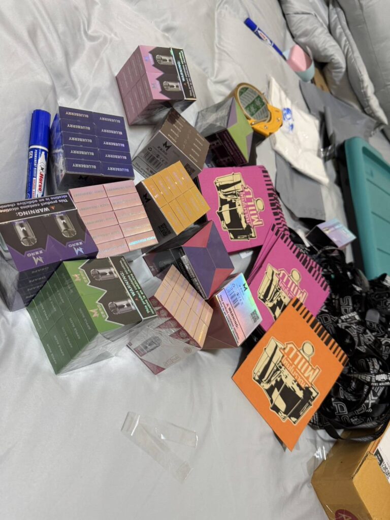 พร้อมตรวจยึดของกลางรวม 5 รายการ อาทิ บุหรี่ไฟฟ้าชนิดสูบแล้วทิ้ง, น้ำยาบุหรี่ไฟฟ้าชนิดเปลี่ยนหัว และเครื่องบุหรี่ไฟฟ้า รวมจำนวน 1,231 ชิ้น มูลค่าความเสียหายประมาณ 300,000 บาท