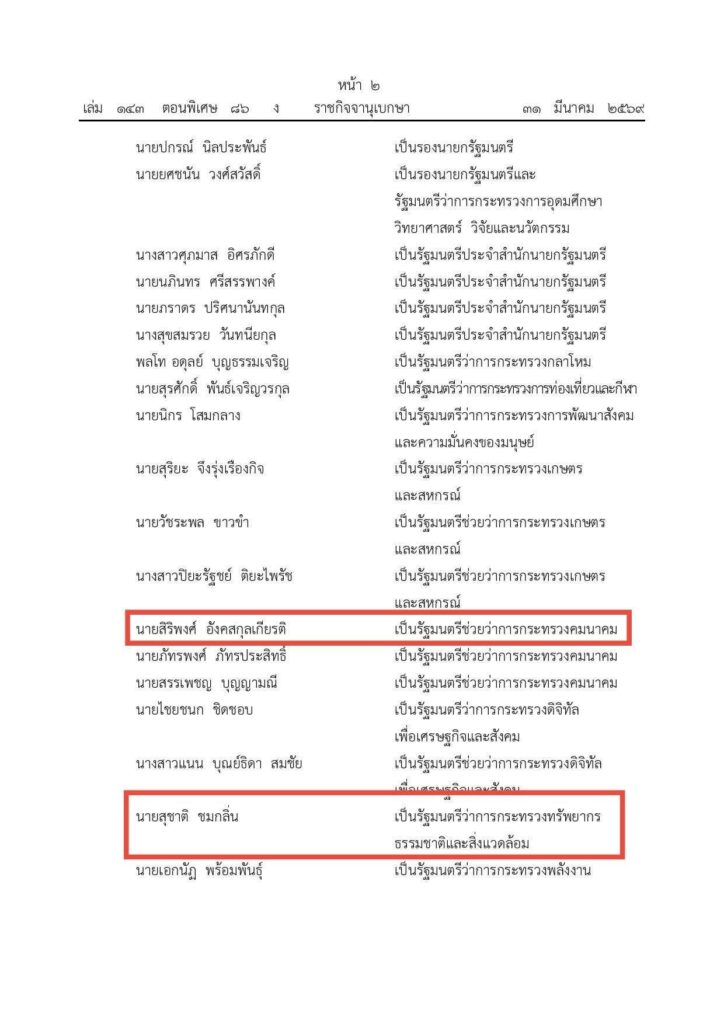 พระบาทสมเด็จพระเจ้าอยู่หัว มีพระบรมราชโองการโปรดเกล้าฯ แต่งตั้งรัฐมนตรีชุดใหม่ โดย นายสุชาติ ชมกลิ่น เข้ารับตำแหน่งรัฐมนตรีว่าการกระทรวงทรัพยากรธรรมชาติและสิ่งแวดล้อม พร้อมด้วย นายสิริพงศ์ อังคสกุลเกียรติ นั่งเก้าอี้รัฐมนตรีช่วยว่าการกระทรวงคมนาคม ถือเป็นการขยับตัวครั้งสำคัญของรัฐบาลที่ดึงมือทำงานเข้าบริหารกระทรวงหลักเพื่อขับเคลื่อนประเทศอย่างเต็มกำลังค่ะ