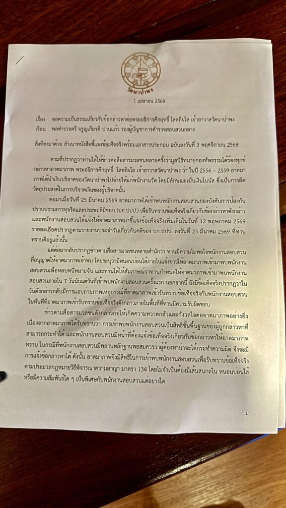 ต่อมาเมื่อวันที่ 25 มีนาคม 2569 อาตมาภาพได้เข้าพบพนักงานสอบสวนกองบังคับการป้องปราบปรามการทุจริตและประพฤติมิชอบ (บก.ปปป.) เพื่อรับทราบข้อเท็จจริงเกี่ยวกับข้อกล่าวหาดังกล่าว และพนักงานสอบสวนได้แจ้งให้อาตมาภาพมาชี้แจงข้อเท็จจริงเพิ่มเติมในวันที่ 12 พฤษภาคม