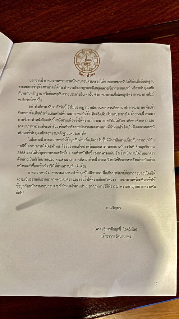 ในโอกาสนี้ อาตมาภาพขอให้ข้อมูลกับท่านเพิ่มเติมว่า ในชั้นที่มีการสืบสวนเกี่ยวกับการกระทำในกรณีนี้ อาตมาภาพได้เคยทำหนังสือชี้แจงข้อเท็จจริงพร้อมเอกสารประกอบ ฉบับลงวันที่ 3 พฤศจิกายน 2568 และได้ให้บุคคลากรของวัดทั้ง 4 คนทำหนังสือชี้แจงมาพร้อมกัน ซึ่งเจ้าพนักงานได้รับเอกสาร