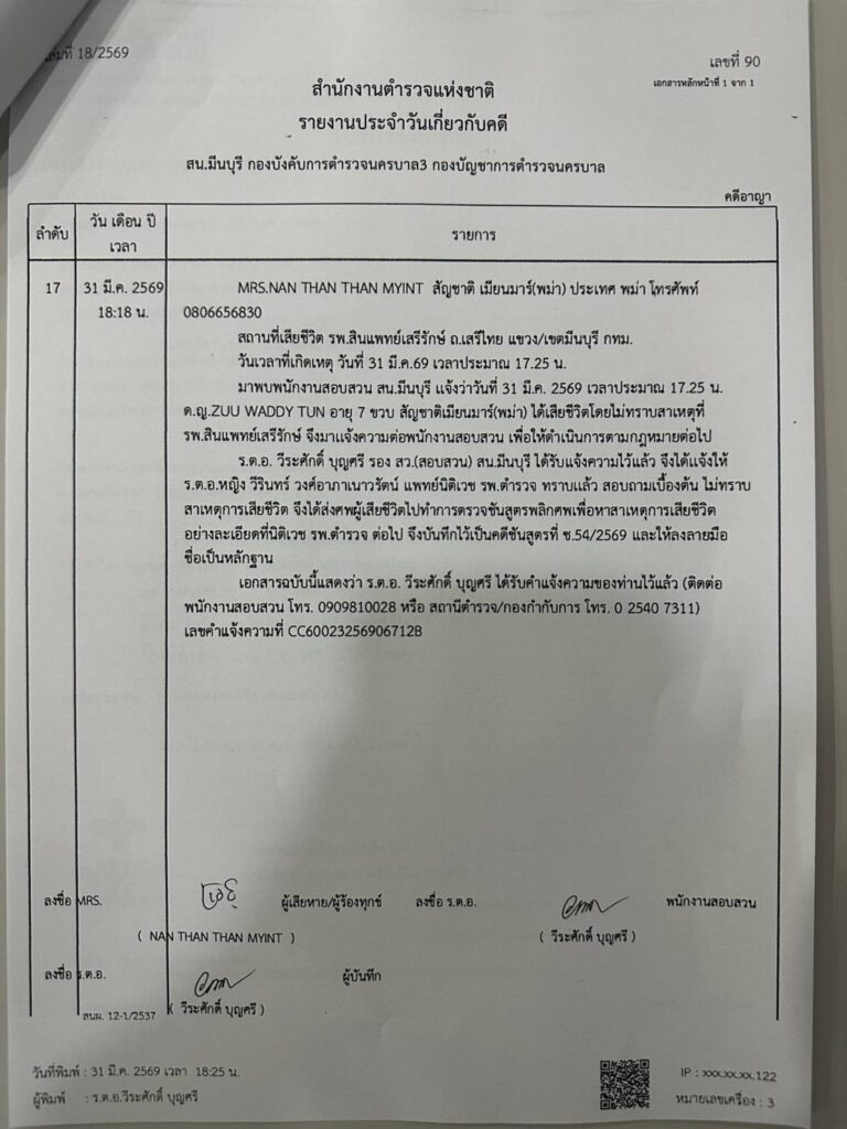 เมื่อวันที่ 31 มีนาคม 2569 เวลา 17.25 น. เจ้าหน้าที่ชุดสืบสวนได้รับแจ้งเหตุสลด มีเด็กหญิงเสียชีวิตจากการถูกทำร้ายร่างกายอย่างทารุณ ภายในบ้านเลขที่ 148 รามคำแหง 190 แขวงมีนบุรี เขตมีนบุรี กรุงเทพมหานคร ทราบชื่อผู้เสียชีวิตคือ เด็กหญิง ZUU WADDY TUN อายุ 7 ปี สัญชาติเมียนมา