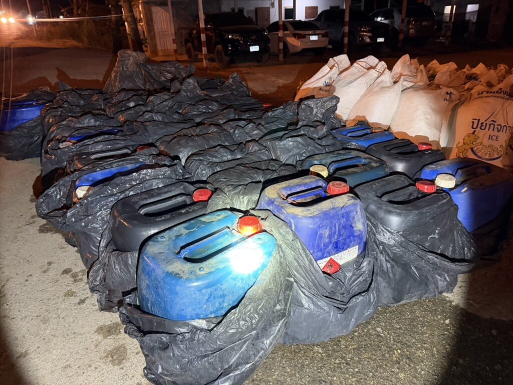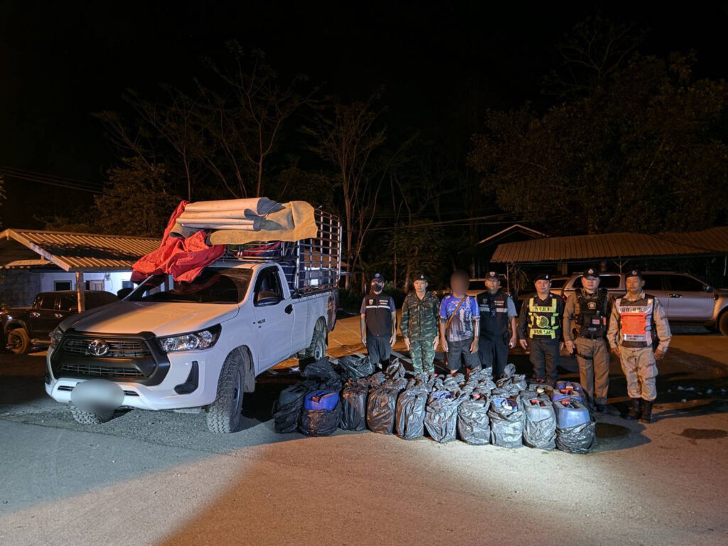 โดยในเวลา 19.10 น. วันที่ 4 เม.ย.69 ได้ตั้งด่านตรวจด้านความมั่นคง เจ้าหน้าที่พบรถกระบะต้องสงสัยวิ่งมาทางถนนสาย 323 บริเวณจุดร่วมน้ำเกริ๊ก บ้านซองกาเรีย อ.สังขละบุรี จึงเรียกตรวจค้น ก่อนพบของกลางน้ำมันแก๊สโซฮอล์ 42 แกลลอน รวม 1,260 ลิตร ซุกซ่อนใต้กระสอบน้ำแข็งท้ายรถ