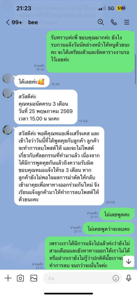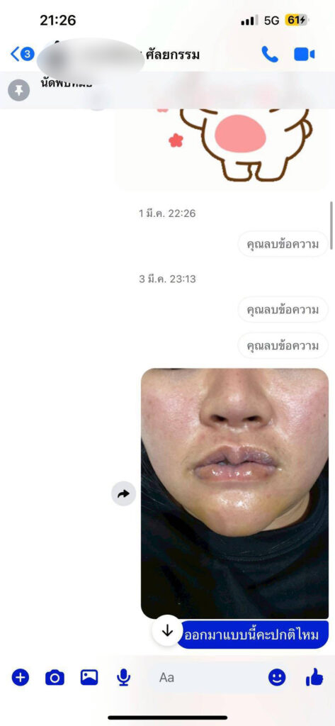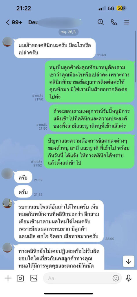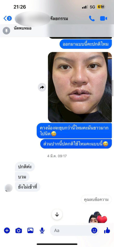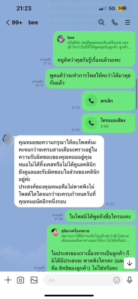 เมื่อพยายามสอบถามไปยังเซลล์และแพทย์กลับได้รับคำตอบว่าเป็นเรื่อง “ปกติ” อีกทั้งเมื่อโพสต์สอบถามในกลุ่มศัลยกรรมกลับถูกลบโพสต์และเตะออกจากกลุ่ม ซ้ำร้ายทางคลินิกยังมีการโพสต์ในลักษณะข่มขู่ว่าจะดำเนินคดีกลับหากทำให้คลินิกเสียชื่อเสียง
