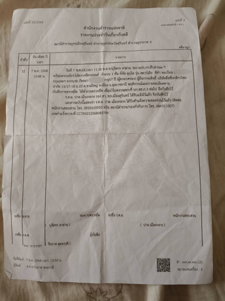 หลังจากวันนั้นตนพยายามเข้าแจ้งความกับพนักงานสอบสวน สภ.เมืองสุรินทร์ มากกว่า 10 ครั้ง แต่กลับถูกปฏิเสธโดยอ้างว่าตนไม่ใช่ผู้เสียหาย บอกว่าตนไม่มีชื่อเป็นเจ้าของรถตามทะเบียน ตนพยายามชี้แจงและแสดงหลักฐานการครอบครองและหนังสือมอบอำนาจจาก น.ส.ภัคคีมา (ซึ่งผ่อนไฟแนนซ์อยู่) ที่ถูกกลุ่มคนดังกล่าวชิงไป ตนพยายามติดต่อ น.ส.ภัคคีมา แต่ไม่สามารถติดต่อได้ทุกช่องทาง แถมยังมีคนอาสาติดต่อมาขอเงิน 1 แสนบาท จะช่วยเคลียร์คดีให้ทั้งหมดอีก ตอนนนี้เครียดมาก เงินก็สูญหมด แถมมีโทร.มาก่อกวนตลอด เป็นแม่เลี้ยงเดี่ยว มีรถยนต์ไม่รู้จักมาจอดซุ่มดูทุกวัน เกรงครอบครัวจะไม่ปลอดภัย