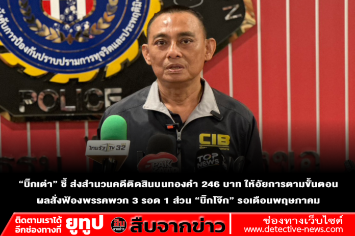 เวลา 15.30 น. พล.ต.ต.จรูญเกียรติ ปานแก้ว รองผู้บัญชาการตำรวจสอบสวนกลาง เผยถึงกรณีที่พนักงานสอบสวน กก.1 บก.ปปป. นำสำนวนคดีสินบนทองคำ 246 บาท ของ พล.ต.อ.สุรเชษฐ์ หักพาล อดีตรองผบ.ตร. และพวก ส่งมอบให้กับสำนักงานอัยการสูงสุดเมื่อช่วงเช้าที่ผ่านมา